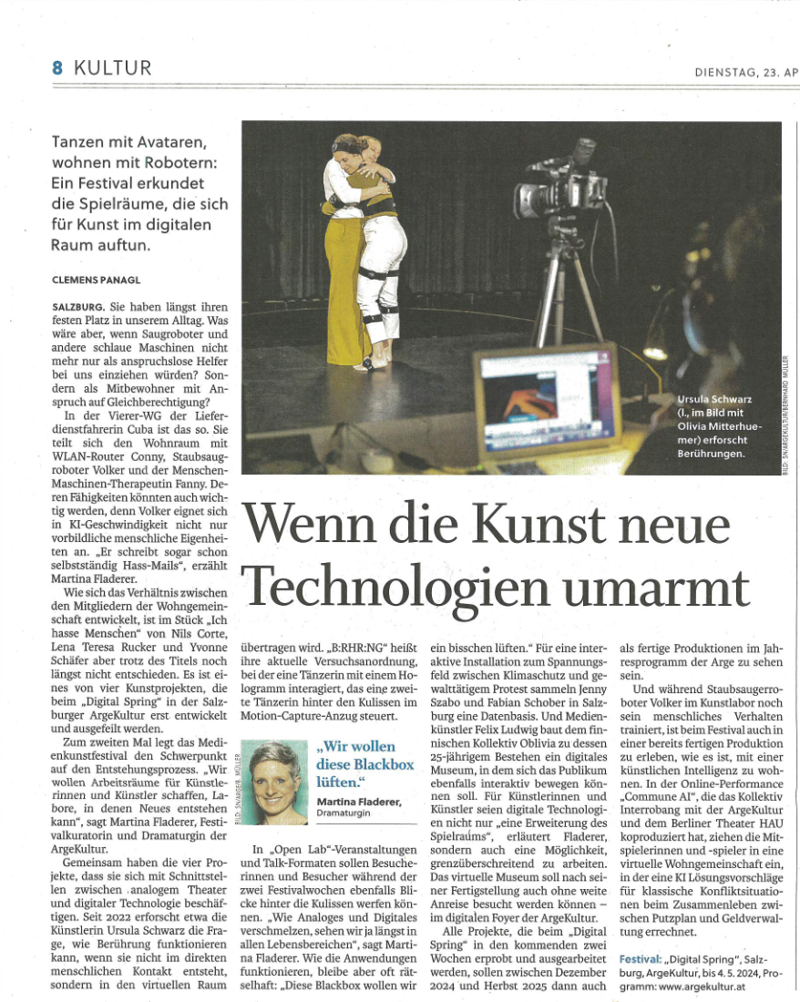 Festival "Digital Spring" in der ArgeKultur: Wenn die Kunst neue Technologien umarmt (Salzburger Nachrichten, 22.04.2024)