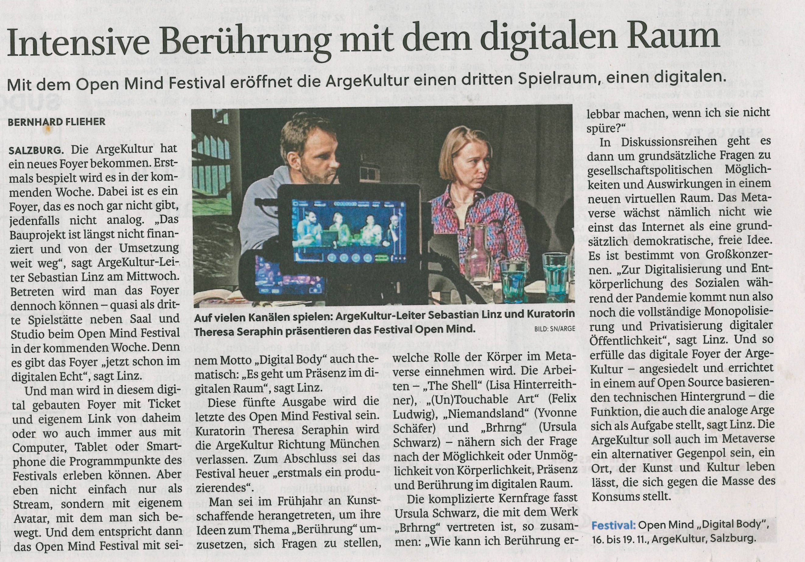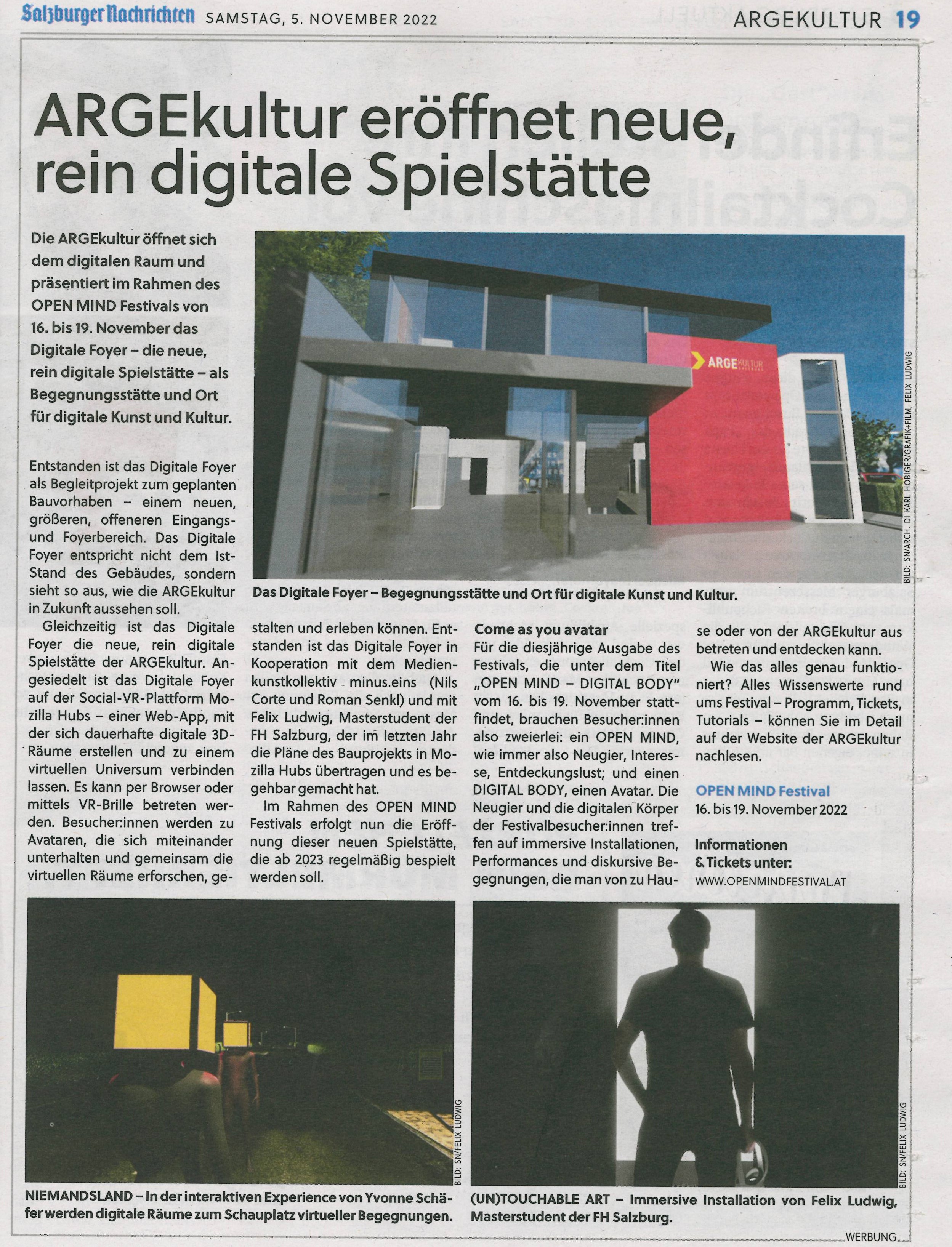 ARGEkultur eröffnet neue, rein digitale Spielstätte (Salzburger Nachrichten, 05.11.2022)