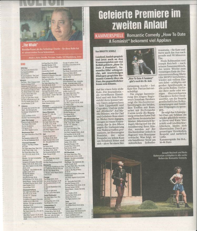 Gefeierte Premiere im zweiten Anlauf: Romantic Comedy "How to Date a Feminist" bekommt viel Applaus (Hamburger Morgenpost, 02.05.2023)